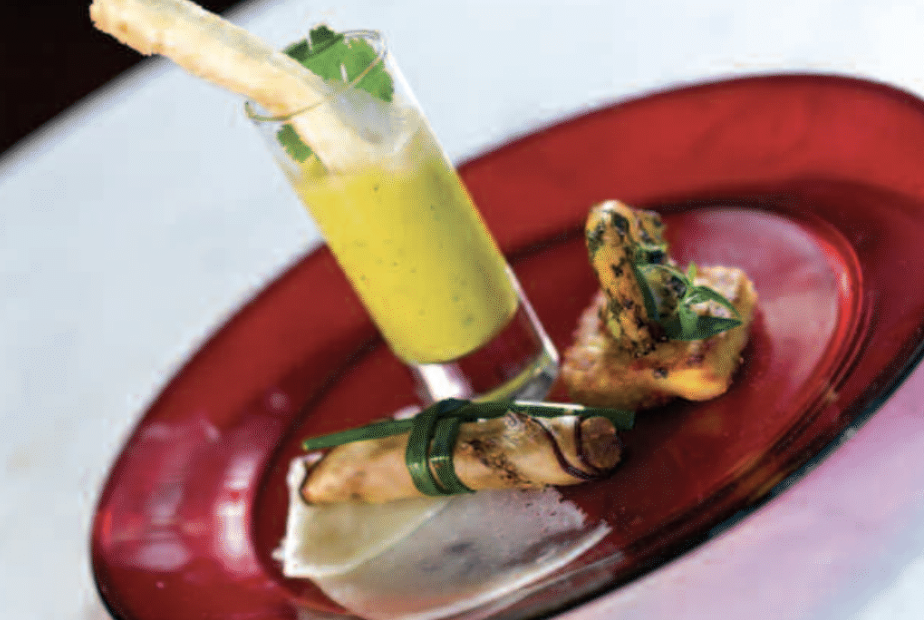 Cut the chilled paella into 10 2-inch square cakes. Sauté the paella cakes in vegetable oil, in batches, until golden brown on both sides. As the cakes are done, place them on a plate lined with paper towels to drain. Add a little more vegetable oil to the pan and sear the shrimp, about two minutes on each side, and transfer to a bowl. Add a half cup of Chimichurri sauce with the shrimp and toss lightly. Transfer the shrimp onto a baking sheet and bake in a 350 degrees oven for 5 minutes. To assemble, place a small dollop of Chimichurri sauce in the center of aPaella cake, then place one shrimp on the square, garnish with fresh tarragon and serve.