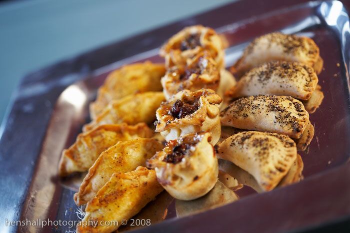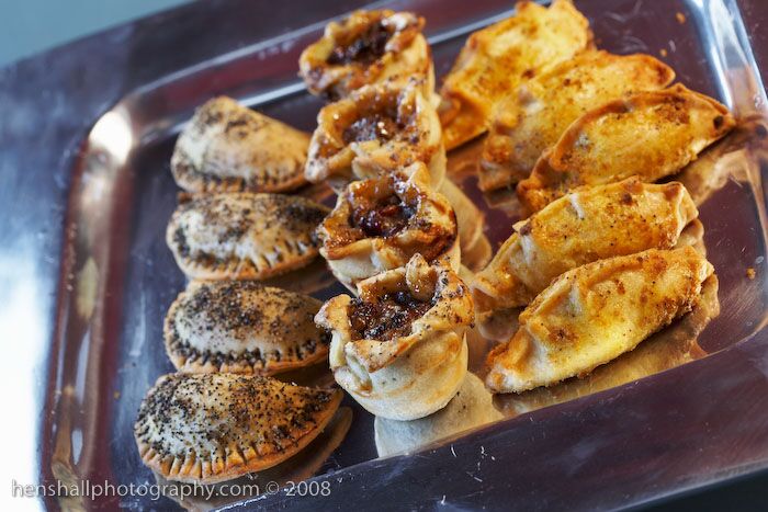 Mix the shortcrust pastry mix with 1/2 cup of water and 1/2 teaspoon onion powder to form a dough. Roll out the dough to 1/8-inch thickness and cut into 31/2-inch circles. Place circles on a flat surface and brush with egg wash. Place a spoonful of the chicken filling in the middle. Fold the pie outer edges together in the middle and pinch the edges of the dough together. Brush with melted butter. Sprinkle heavily with the curry salt topping. Bake in the oven at 375 degrees 20-30 minutes until golden brown and cooked. These can be frozen until ready to cook.