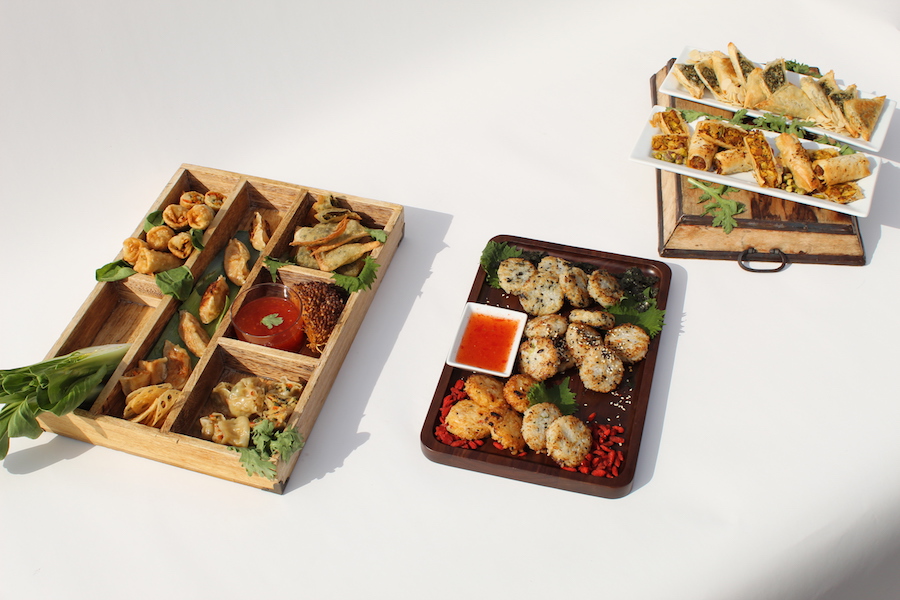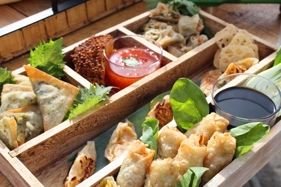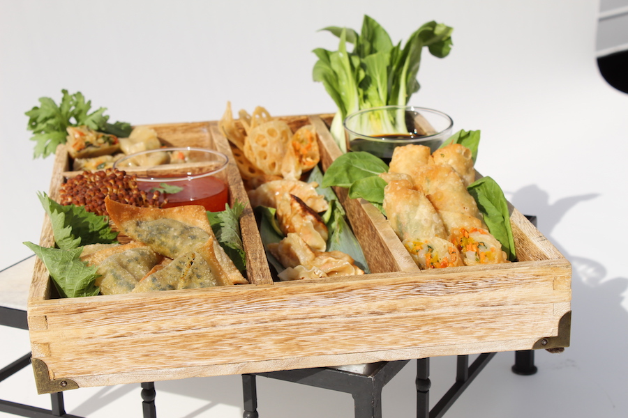 Asian platter with wonton, dumpling, lumpia and Rangoon with dipping sauces