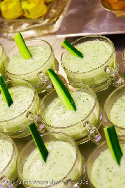 In a food processor or blender, puree the cucumber, mint, scallions, dill and garlic until well combined but not smooth. Add yogurt and continue to puree until smooth. Chill for 4-6 hours over night. Adjust seasonings and serve the soup in a demitasse cup garnished with a cucumber wand.