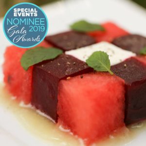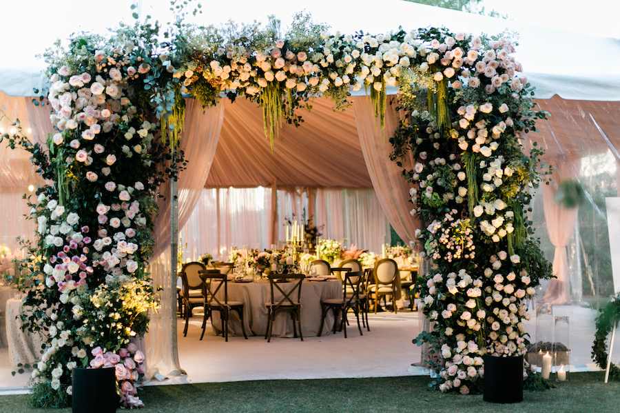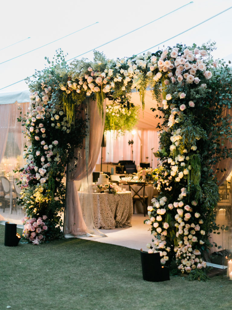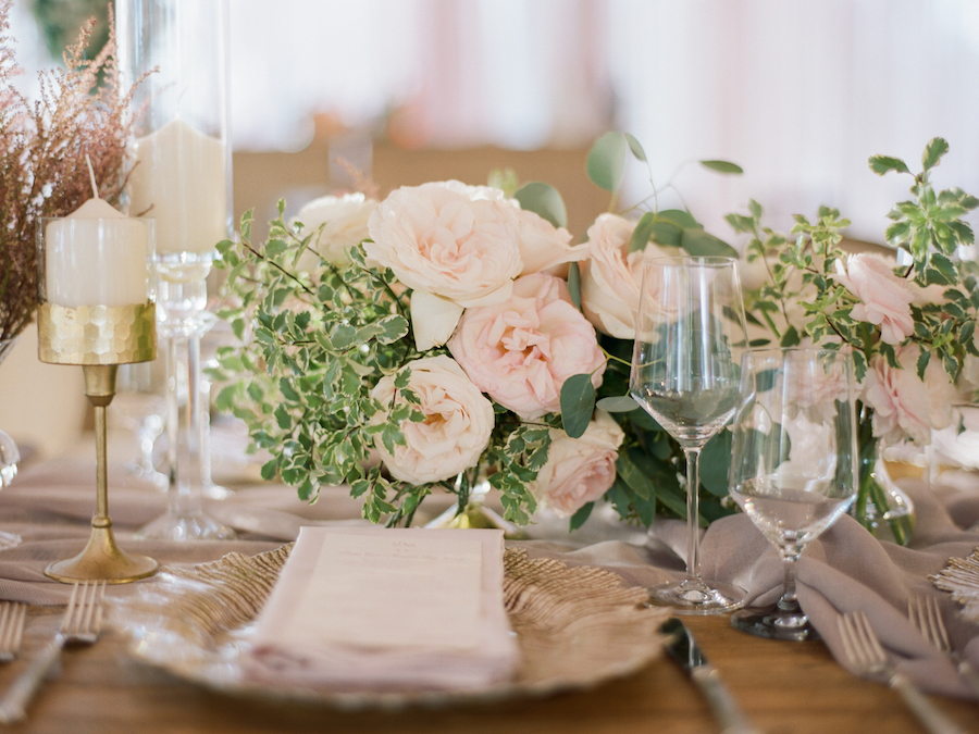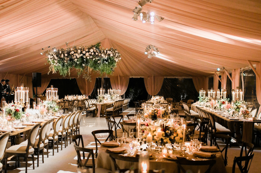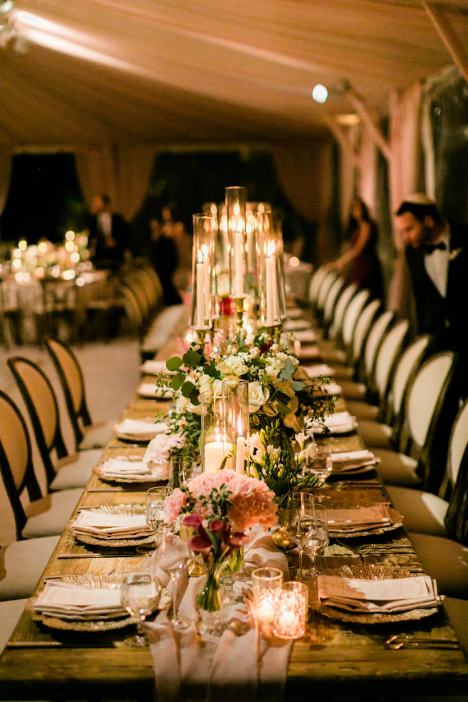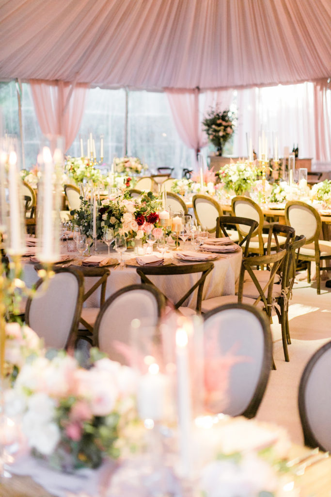 Following a beautiful ceremony, guests were invited to continue the celebration in a tented reception! Guests entered the tent through a stunning floral arch. The tent was draped in soft blush draping, and filled with long wooden tables and round tables draped in blush linen. Tables were set with gold textured chargers, crystal glassware, and towering candelabras. Nancy Kaye of Mark’s Garden elevated the tables with a gorgeous display of florals of blush, mauve and ivory!