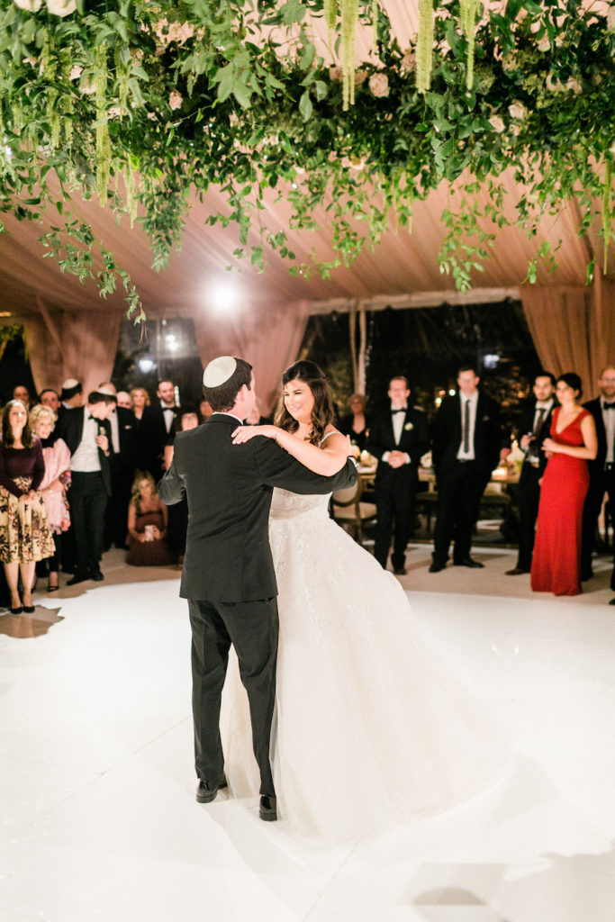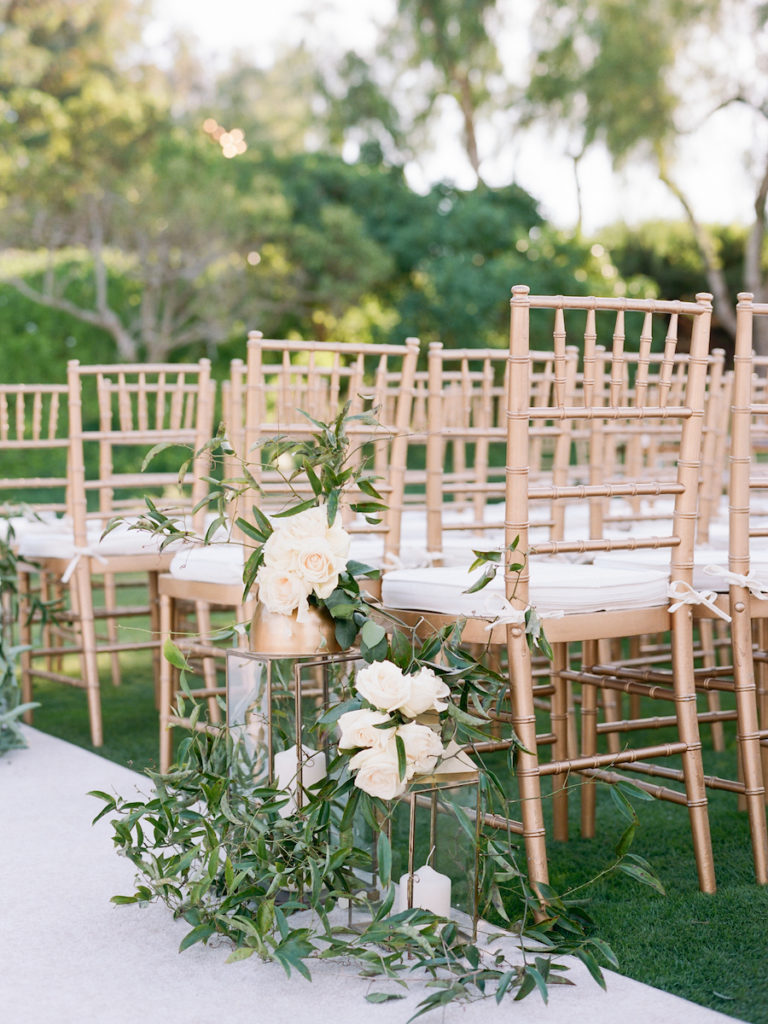 “Held on the grounds of The Bridges at Rancho Santa Fe, this naturally pretty setting set the tone. As the sun set, guests were escorted to an incredible ceremony space. On a white carpet, guests took their seats on rose gold chairs. The aisle was lined with lush greenery and ivory roses. Our couple exchanged vows beneath the most incredible Chuppah made of lush greenery, and in florals of blush, mauve and ivory roses. To complete the look, the moment was lit with a crystal chandelier!