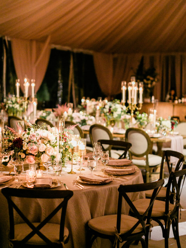 Following a beautiful ceremony, guests were invited to continue the celebration in a tented reception! Guests entered the tent through a stunning floral arch. The tent was draped in soft blush draping, and filled with long wooden tables and round tables draped in blush linen. Tables were set with gold textured chargers, crystal glassware, and towering candelabras. Nancy Kaye of Mark’s Garden elevated the tables with a gorgeous display of florals of blush, mauve and ivory!”