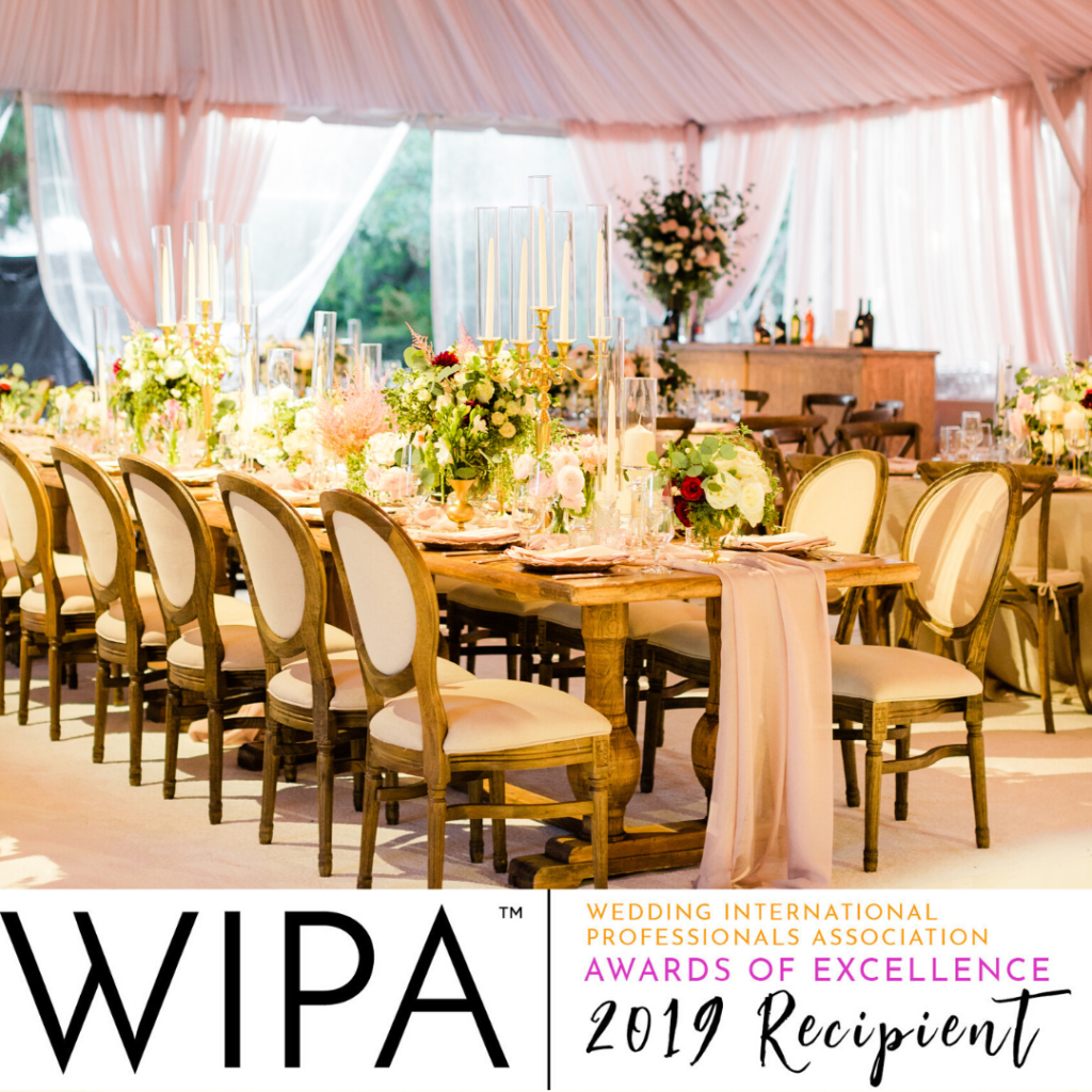 We are so excited to share that Good Gracious! Events is the winner of the 2019 Catering Company of Excellence for WIPA 2019 Awards of Excellence! “Held on the grounds of The Bridges at Rancho Santa Fe, this naturally pretty setting set the tone. As the sun set, guests were escorted to an incredible ceremony space. On a white carpet, guests took their seats on rose gold chairs. The aisle was lined with lush greenery and ivory roses. Our couple exchanged vows beneath the most incredible chuppah made of lush greenery, and in florals of blush, mauve and ivory roses.